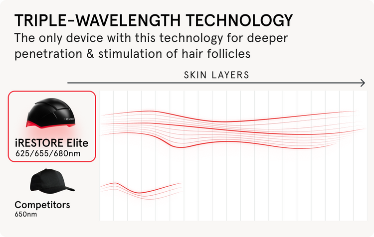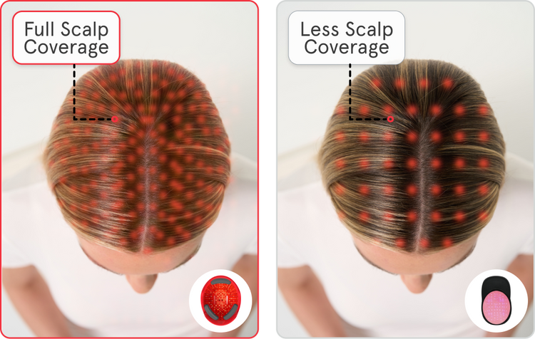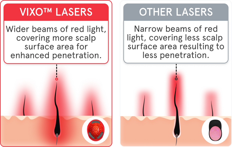 Unlike lasers, LEDs cover a much wider area of your scalp and allow light energy to spread out evenly, while still penetrating deep enough to reach your hair follicles.